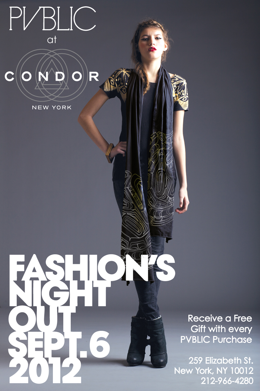 Don't forget, if you're in the NYC area tonight celebrating the world-wide event known as Fashion's Night Out, stop by Condor in Nolita and receive a free PVBLIC gift with purchase! We're giving a hand printed, combed cotton scarf (pictured below). And have fun tonight!